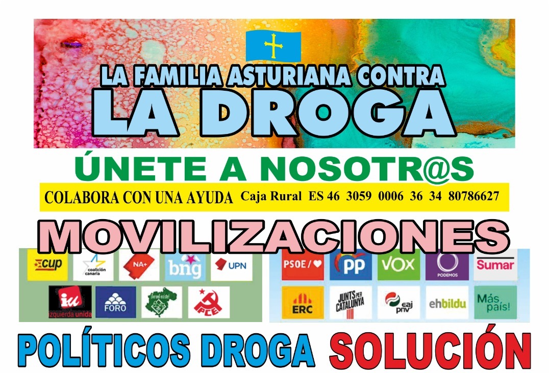 Denunciamos el genocidio a través de las drogas, que están cometiendo contra una parte de la mocedá Asturiana, y el enorme sufrimiento de nuestras familias, con la complicidad de los partidos políticos con representación Institucional que llegan al Poder y los que les apoyan, negándose a cambiar las leyes que favorecen a los narcos y el consumo de drogas para la solución del problema. Pueden salvar muchas vidas y quitar mucho sufrimiento a las familias. Esto no es importante para ellos.